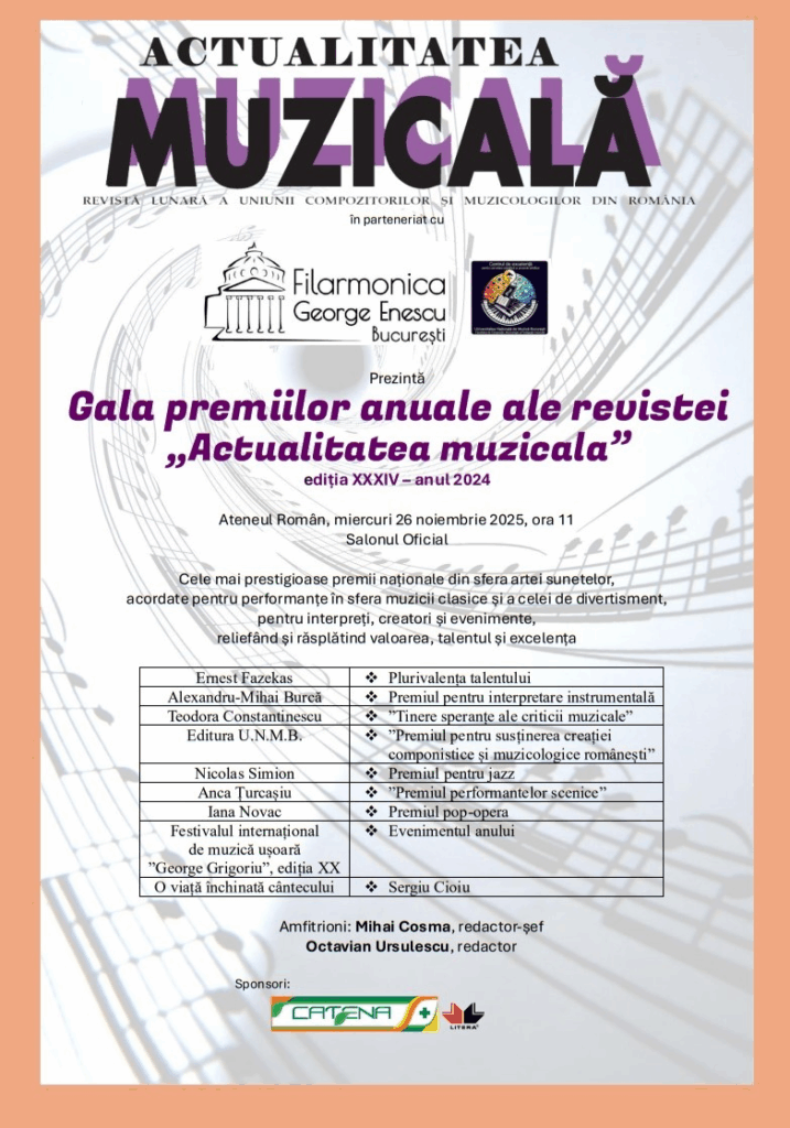 Gala premiilor anuale ale revistei „Actualitatea muzicală” de la Ateneul Român din 26.11.2025. stiri_ultima_ora | 2025-11-26 | Arta, Creatie, Cultura, Economice, Externe, Mondene, Muzica, Politice, Sanatate, Sociale, Sport, Sportive, Stiri Ultima Ora | Niciun comentariu https://mcppress.ro/forum/viewtopic.php?t=852 Sursa: Mihail Georgevici, MCP Press Agency Related Posts ULTIMUL ARTICOL al lui Eminescu din Timpul Niciun comentariu | oct. 20, 2021 Albumul cu poze aparținând MCP Press Agency, de la evenimentul Serata „Eminescu Jurnalistul” Niciun comentariu | feb. 17, 2024 Iată că nu întâmplător, „partidul conducător” PCR (PSD) e și…dăunător! Niciun comentariu | dec. 14, 2021 Videoclipul cu „Dumitru Dorin Prunariu, singurul român care a zburat vreodată în spațiul cosmic” Niciun comentariu | iun. 2, 2020