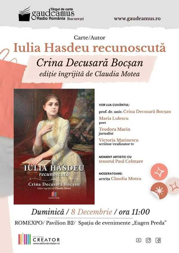 Lansarea de carte „Iulia Hașdeu recunoscută” Crina Decuseară Bocșan / Ediție îngrijită de actrița Claudia Motea