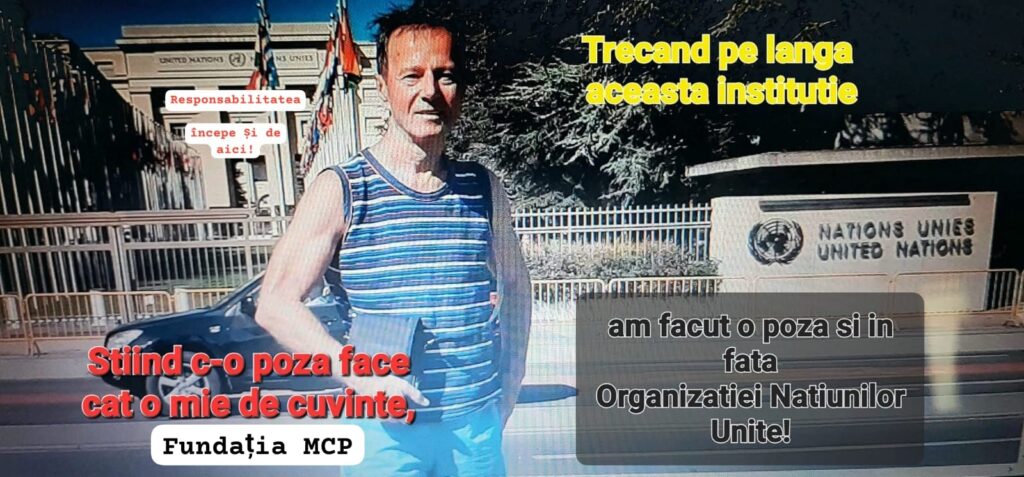 Dacă priviți această poză, mă vedeți la poarta de intrare de la Organizația Națiunilor Unite, în fața a zeci de steaguri, de unde reiese implicarea mea, ca reprezentant activ al societății civile, președinte al Fundației MCP (MASS COMMUNICATION POWER) cu vechime de cca. trei decenii de activitate.